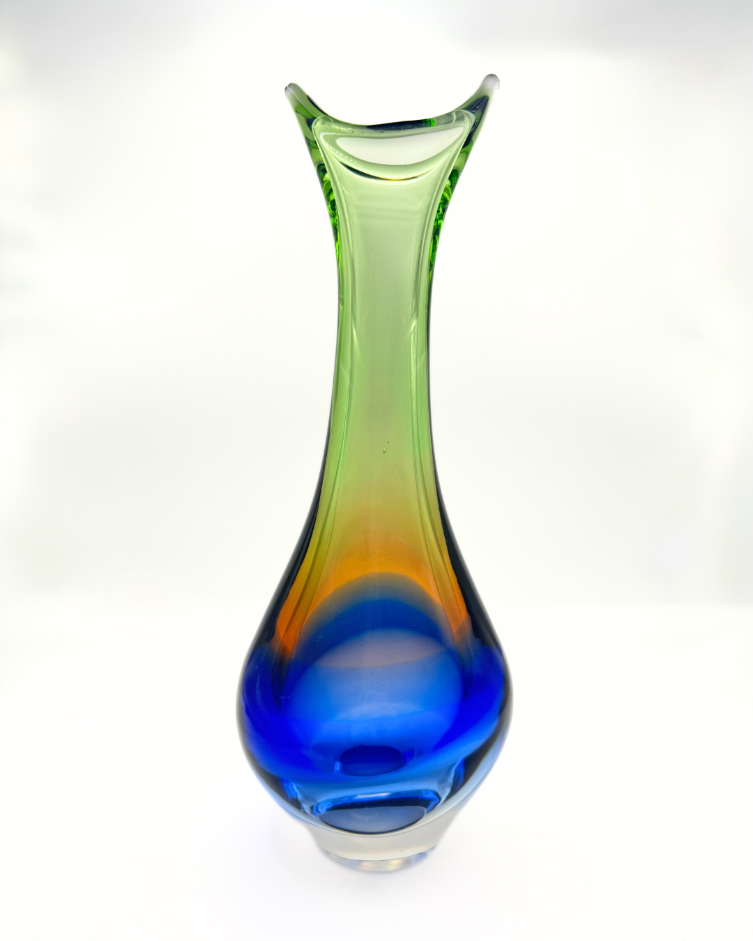 A tall and beautifully sculpted example from the Duha range, designed by Vladimir Mika in the 1960s. Standing at 28cm, this Czech art glass vase features the signature horizontal bands of colour — deep cobalt blue rising into amber, finishing in soft green — all cased in thick clear crystal.
