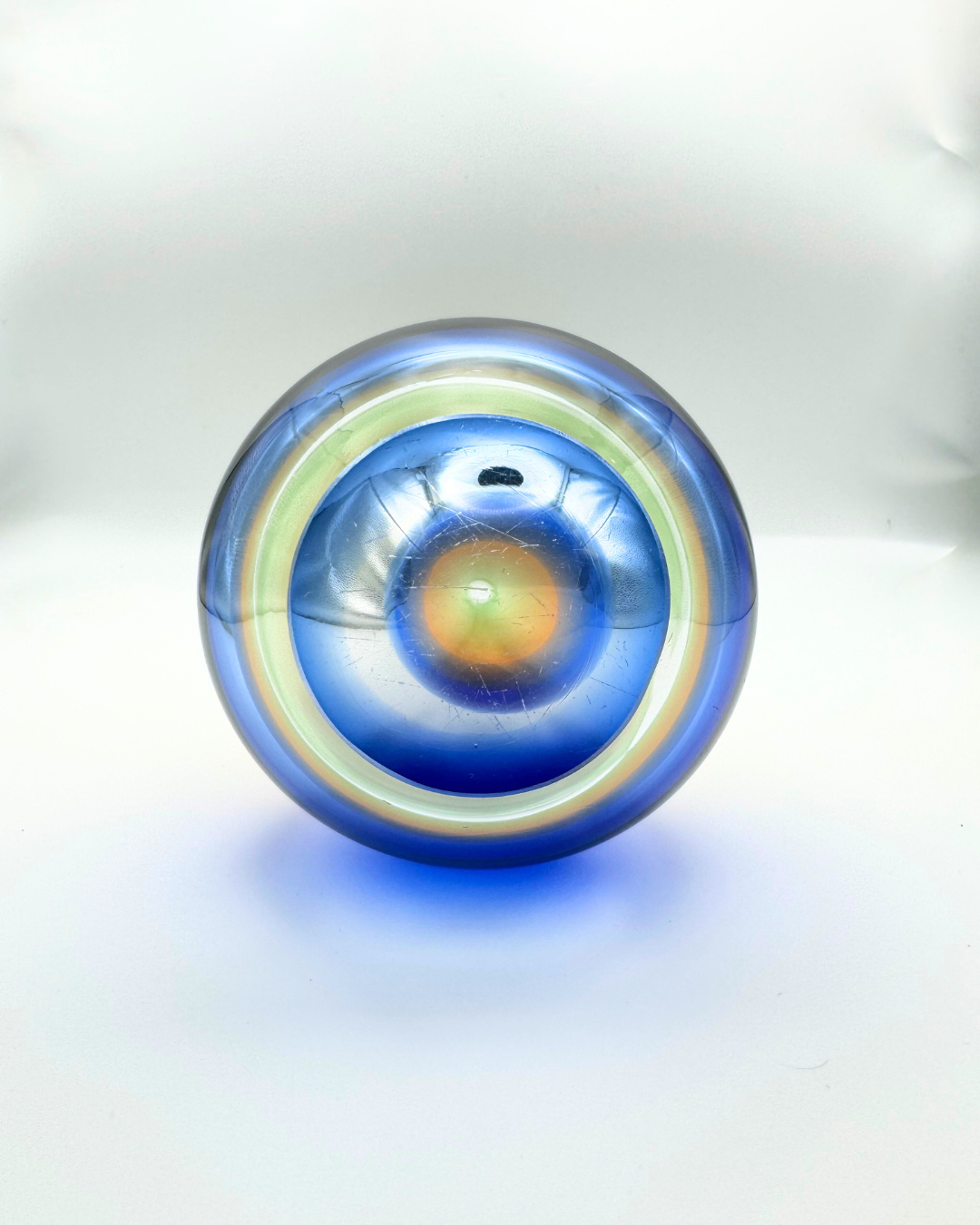 Due to the nature of creating art glass, pieces may exhibit inclusions or imperfections in their form. Pieces may also include minor fleabites, light marks or light scratches to the surface of the glass which are impossible to highlight in the photography.