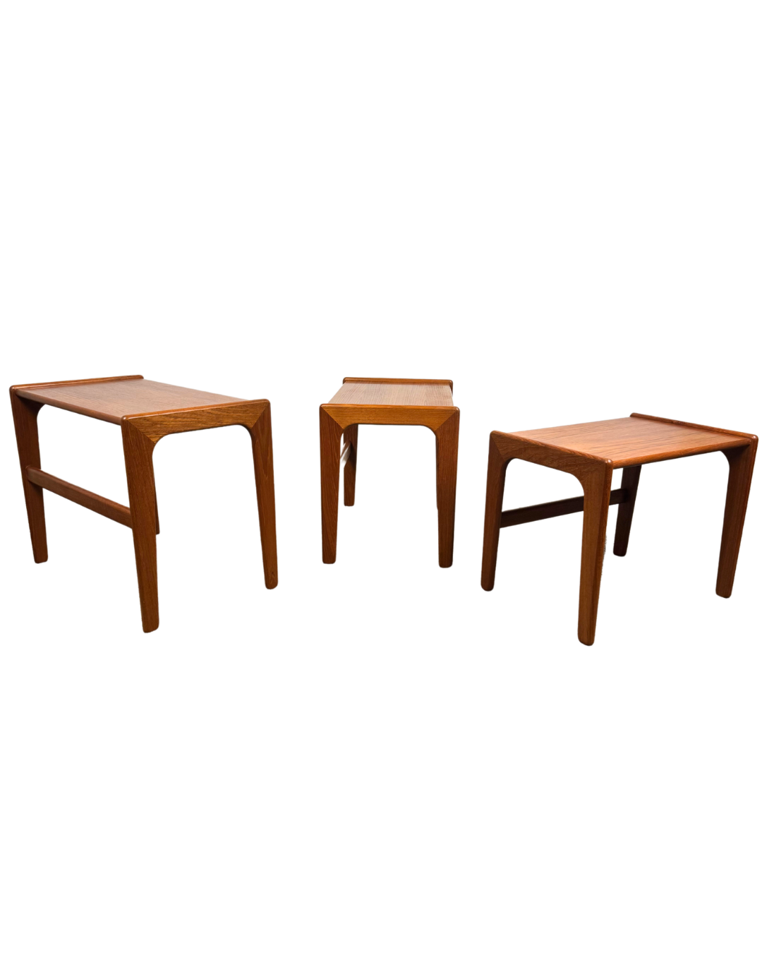 Crafted in the 1960s, this set of three teak nesting tables is a quiet showcase of Scandinavian design at its best. With clean lines, gently rounded corners and a warm, golden patina, they offer understated style and everyday usefulness in perfect balance.