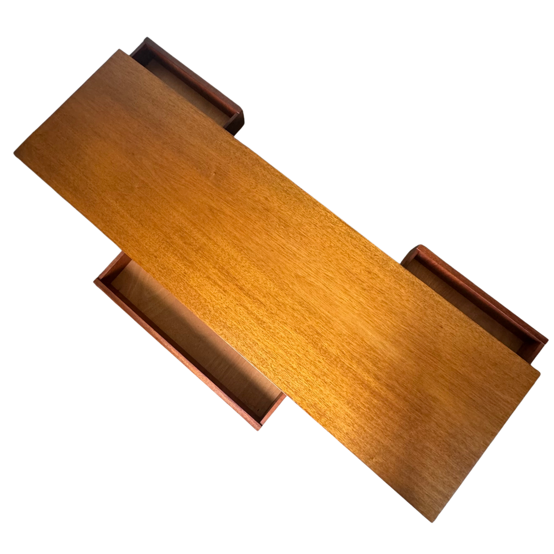 Constructed from teak and featuring three double-faced drawers that can be accessed from either side of the table.