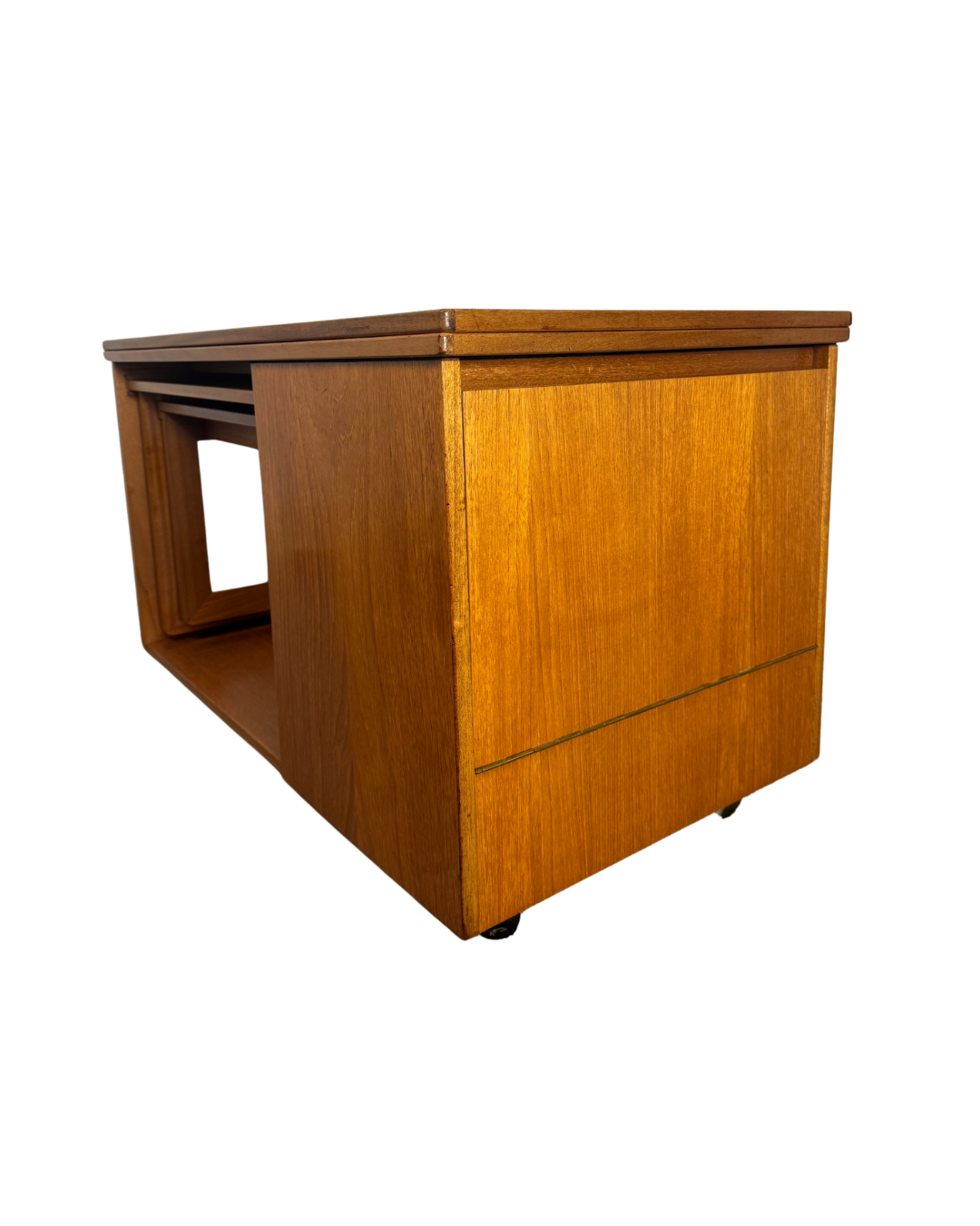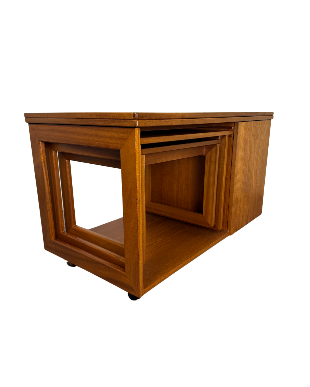 This piece integrates a nest of two tables and a cabinet neatly under an extending coffee table. The Tristor is also fitted with castors for easy manoeuvrability.