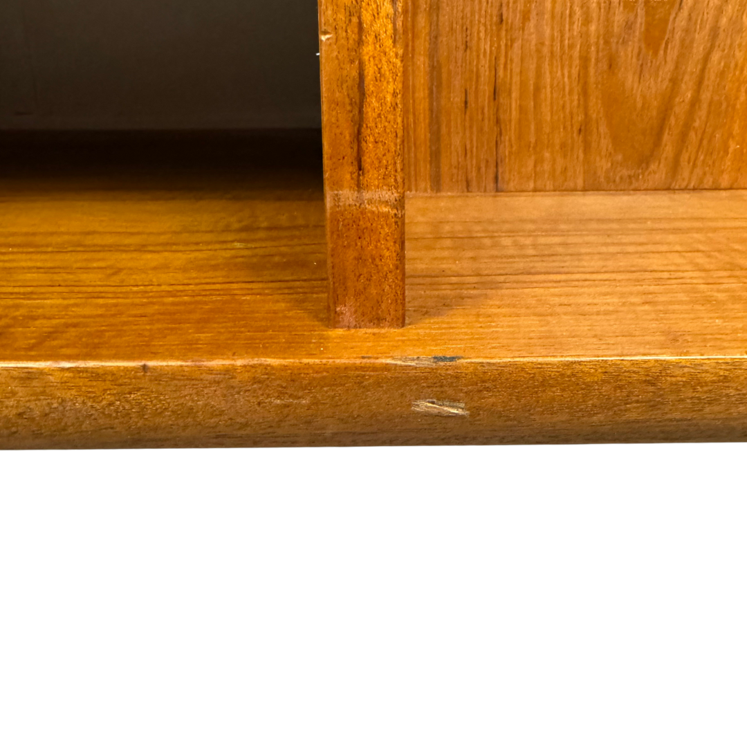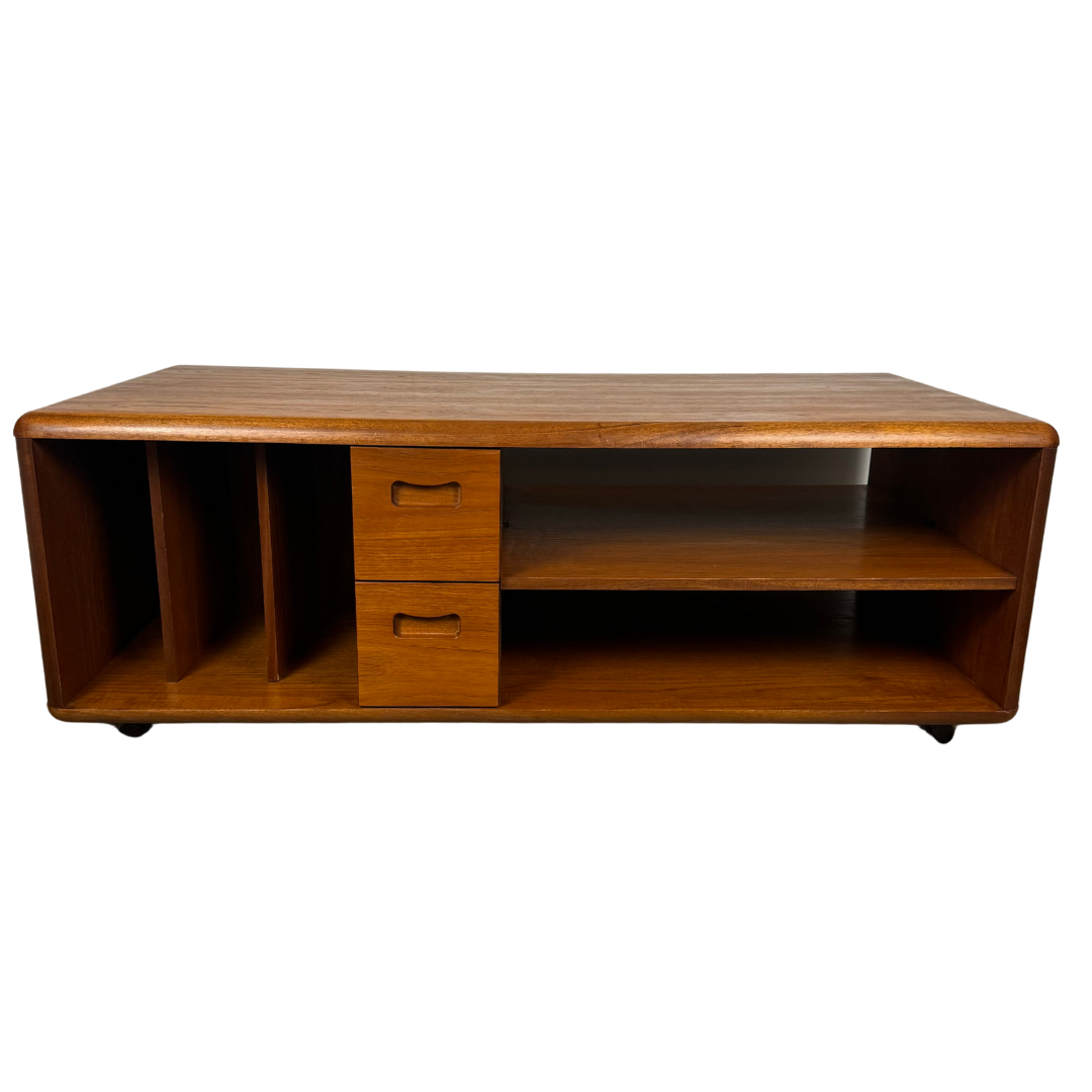 Fitted with caster wheels, this teak Meredew coffee table/media unit is a stylish and useful addition to any living room. Featuring minimal clean lines with divided storage space perfect for vinyl LPs. Two small drawers with recessed handles and a large shelved area. This versatile piece can also act as a TV and entertainment unit.