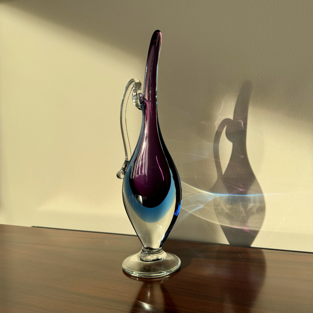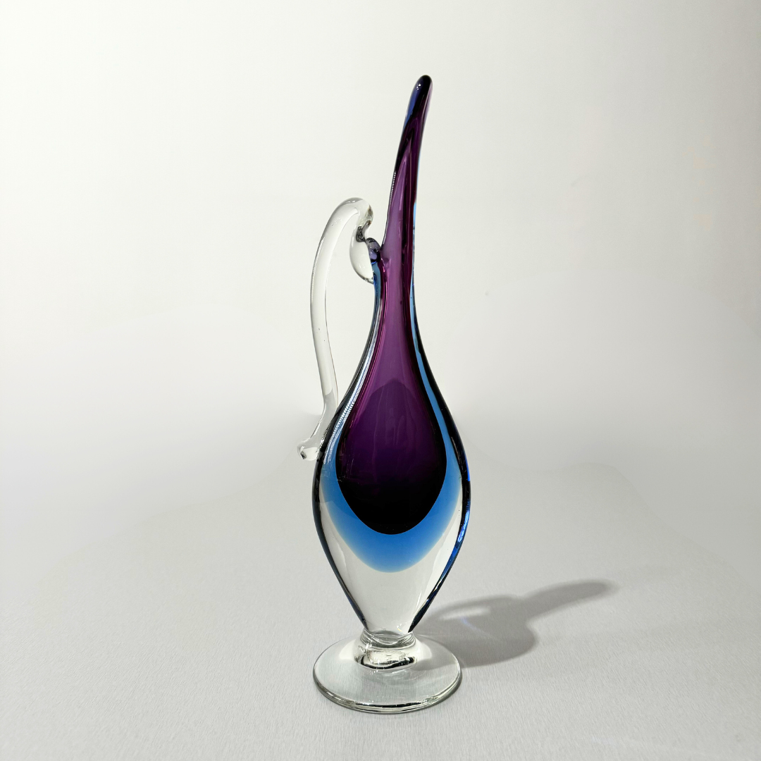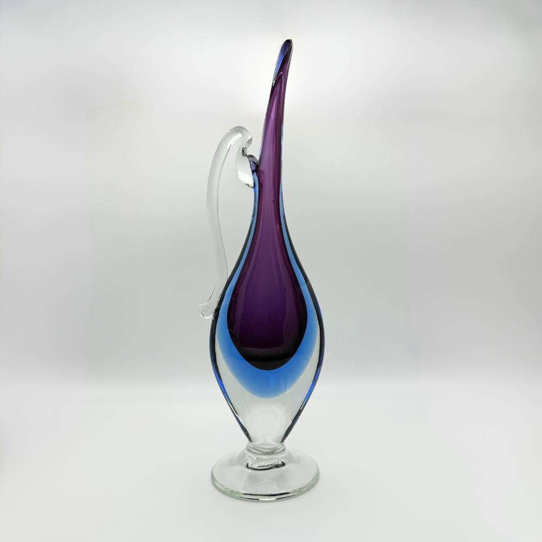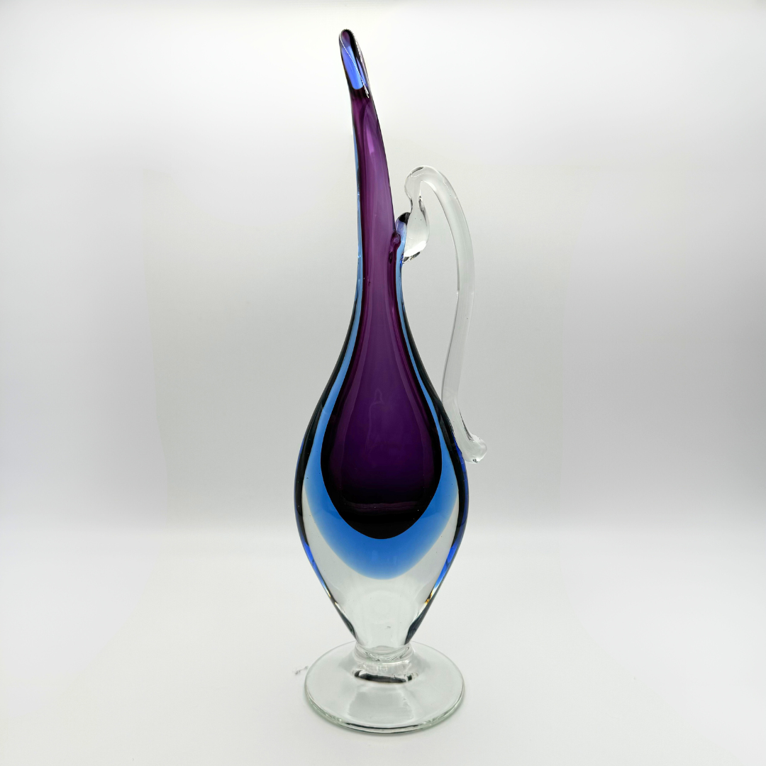 A wonderful Venetian glass vase in the style of a jug, made on the island of Murano, attributed to Mandruzzato glassworks. It is a stunning combination of blue and purple glass, encased in clear glass using the renowned Venetian sommerso technique. This would be a stunning addition to any collection or as a standalone piece.