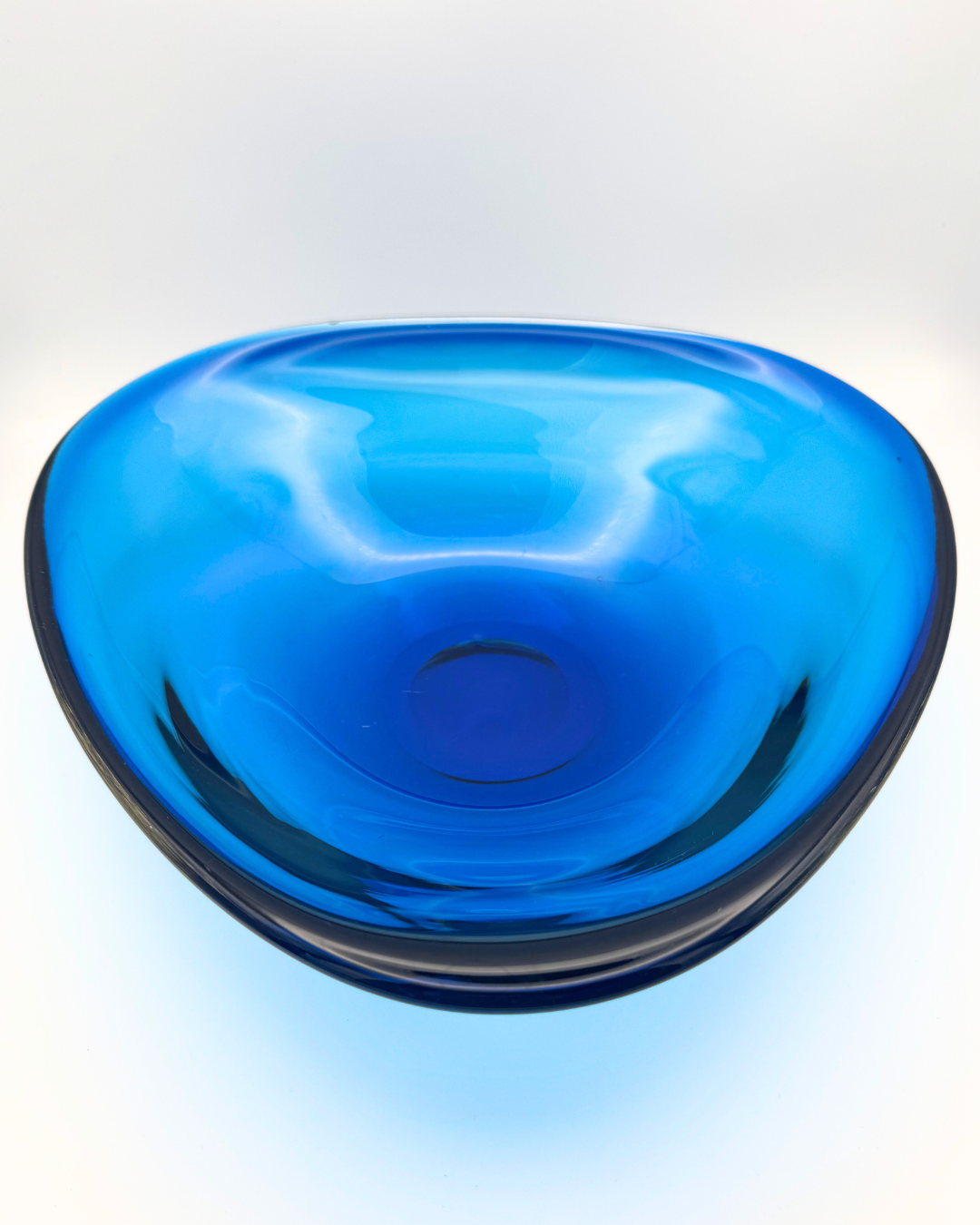 Rare Kingfisher Blue example of the large #9526 tricorncased glass bowl. Designed by Geoffrey Baxter for Whitefriars Glass.